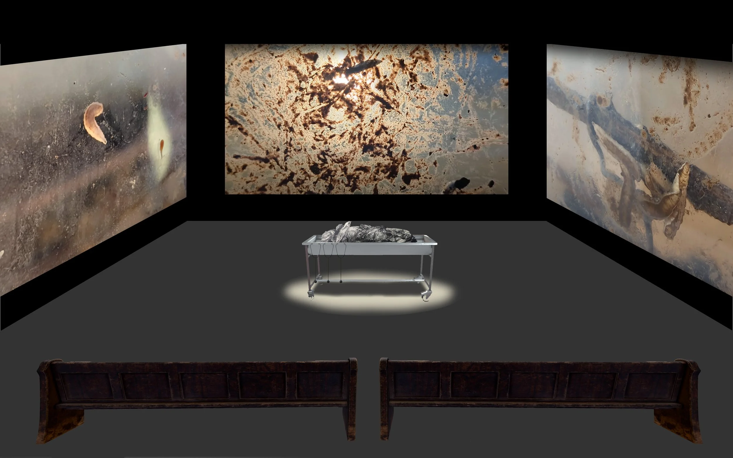 The proposed project presents an uneasy clash between an anthropogenic environment of ritualized preservation, and the mutability of decay. Upon entering the space, participants are enveloped by a three-channel video of blowfly larvae, installed across three walls (the fourth contains bench seating). Shot through the glass of the larvae’s terrarium, the videos are semi-abstracted by condensation, light flares, and muddy slime; framing the installation space in “stained glass” that separates the pristine interior from a messy, rotting exterior. A chorus of voices reverberate from speakers placed around the room, oscillating between ecstasy and despair as if unsure of who, what, and how to mourn from this position of complicity. At the center of this container lies an (in)human figure on a steel table. In contrast to its formally clean surroundings, it is twisted, hollow, unbound. Small transducers are embedded within. If you listen through one of three stethoscopes provided alongside the table (implicating yourself in the clinical observation of this body), you can hear Other sounds: the soft wet undulations of maggots, buzzing blowflies, hissing vultures, croaking ravens, wind in the trees, falling leaves, bird song, a distant stream.