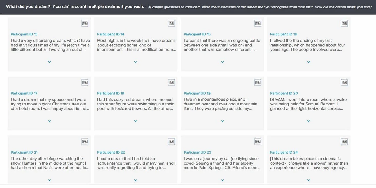 In an effort to gain insight into our experience of the pandemic from an emotive, non-rational angle, I invited anyone who wished to share their pandemic-related dreams with me. Many people mentioned feeling that their dreams were more frequent, more memorable, and/ or stranger. Common themes included the need to protect others, the need to escape, storms and other dangerous outdoor events, encompassing indoor spaces, social distancing, masking, and feelings of anxiety, powerlessness, fear of proximity to others, and (fear of) isolation and loneliness.