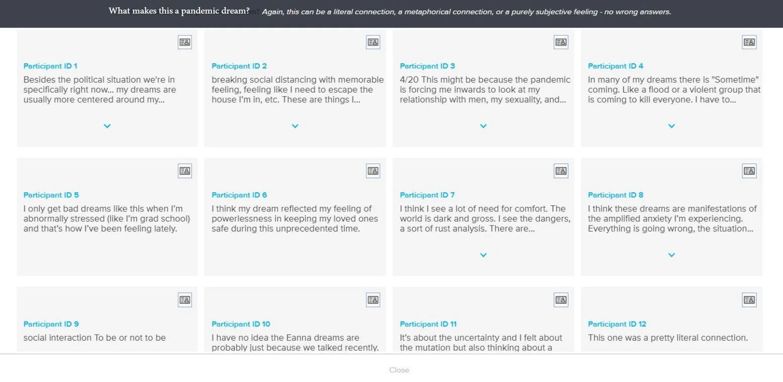 You can access the survey via the link below. I have also included an excerpt of anonymized responses, alongside a redacted version of the full survey results. Although survey participants are not indicative of a well-balanced sample, they nonetheless offer a fascinating partial view onto the interiority of the early pandemic consciousness.