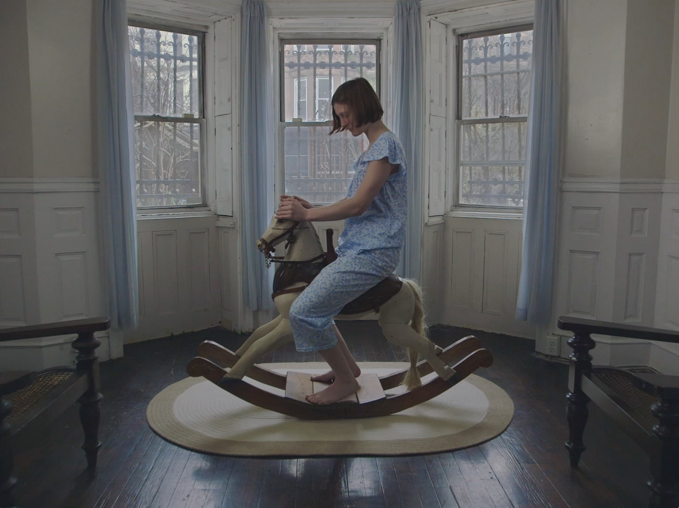 In Regular Programming (2017), the desire for freedom manifests itself through a woman’s unabashed masturbatory action. Viewers are made voyeurs through the camera’s gaze as it slowly zooms in from across the room, and the video cuts between the intimate scene and footage of a horse race - fighting to censor the shameless content.